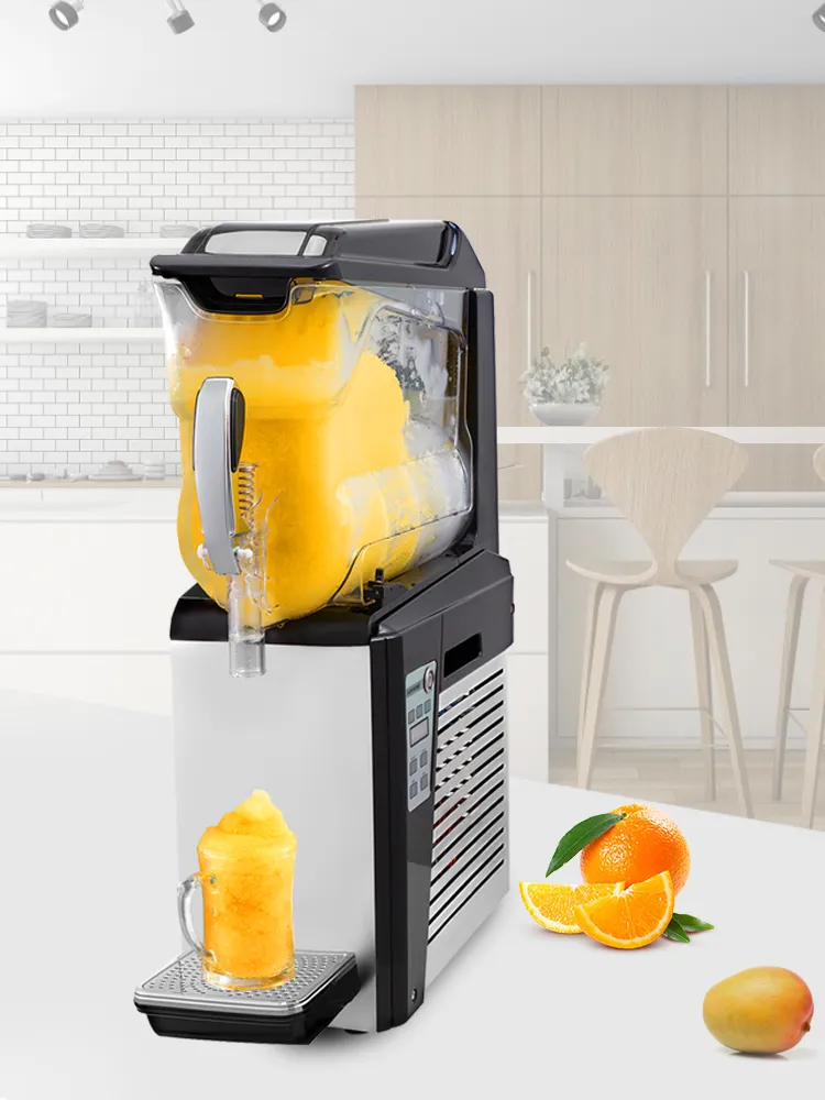 Diese leistungsstarke und praktische Maschine, die Slush- und gefrorene-Getränke-Funktion in einem Gerät vereint, ist eine gute Wahl für Getränkeläden, Cafés, Restaurants, Kioske, Märkte im Freien usw. Äußerst kosteneffektiv und führt zu großen Geschäftsmöglichkeiten.