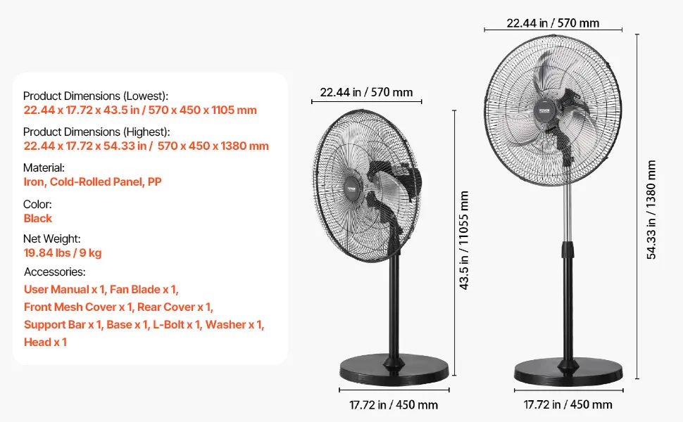 Höhenverstellung: Unser Ventilator bietet einen Höhenverstellungsbereich von 43,5 bis 54,3 Zoll (110,5 bis 138 cm), sodass Sie die Höhe des Ventilators an Ihre Indoor-Aktivitäten oder Arbeitsplatzanforderungen anpassen können