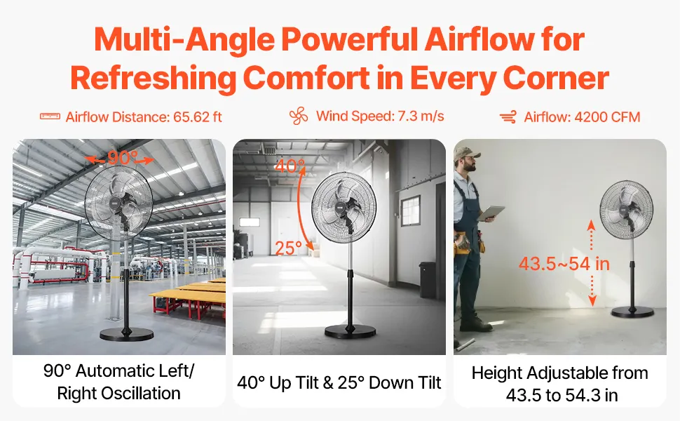 Egal, ob Fabrik, Lagerhaus, Werkstatt: Sie können den vertikalen und horizontalen Winkel sowie die Höhe des Raumventilators ganz einfach einstellen, um die gewünschte Wohlfühltemperatur zu erreichen.