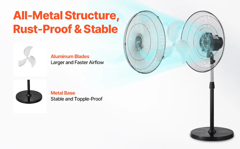Unser Ventilator ist mit einem stabilen Metallrahmen ausgestattet, der auch bei stundenlangem Hochgeschwindigkeitsbetrieb eine gleichmäßig kühle Brise liefert. Der solide Standfuß minimiert Erschütterungen und verringert die Gefahr des Umkippens.