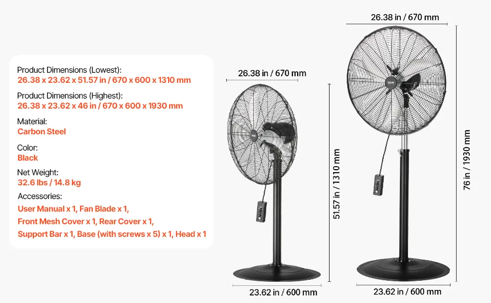 Höhenverstellung: Unser Ventilator bietet einen Höhenverstellungsbereich von 51,2 bis 76 Zoll (131 bis 193 cm), sodass Sie die Höhe des Ventilators an Ihre Indoor-Aktivitäten oder Arbeitsplatzanforderungen anpassen können
