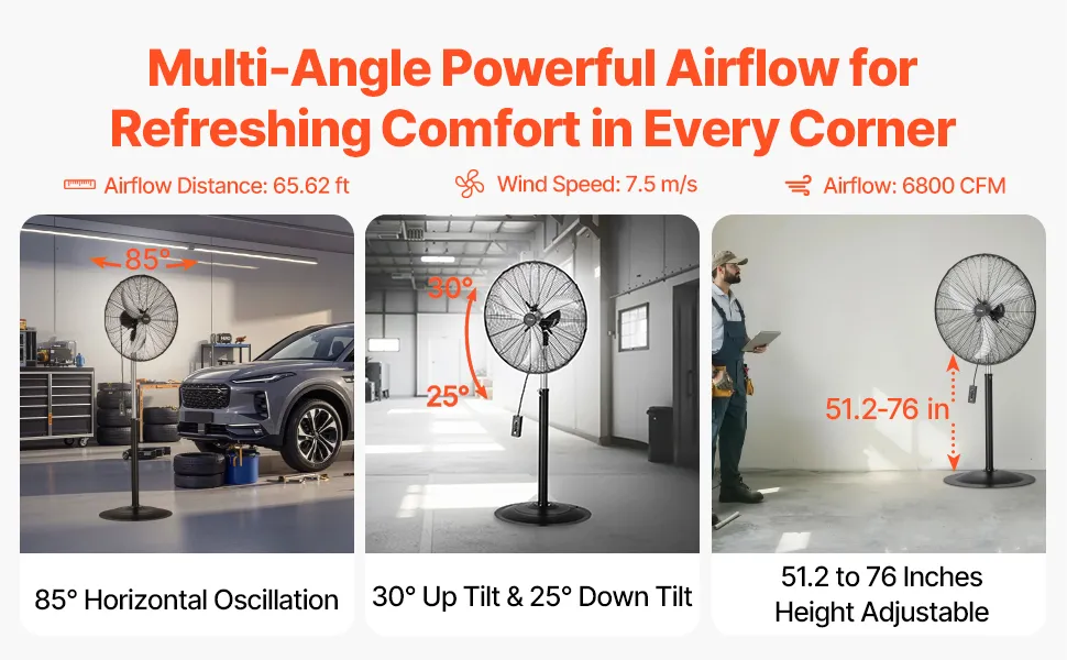 3-stufige Geschwindigkeitseinstellung: Dieser Standventilator bietet 3 einstellbare Geschwindigkeitseinstellungen, sodass Sie den Luftstrom für Entspannung oder Indoor-Aktivitäten anpassen können. Mit einem leistungsstarken Luftstrom von 6800 CFM und einer Windgeschwindigkeit von 7,5 m/s bleiben Sie kühl und erfrischt