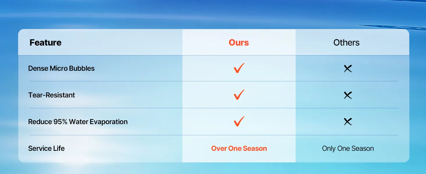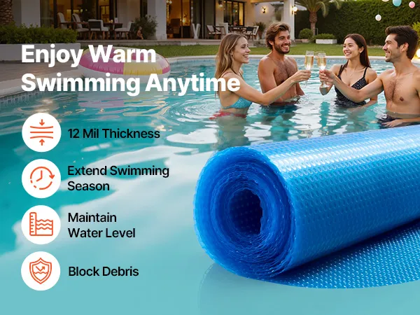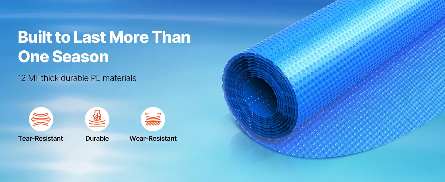 Die Solar-Poolabdeckung verfügt über dicht gepackte Mikroblasen, die die Wärmespeicherung effektiv verbessern und den Wärmeverlust reduzieren, sodass Ihr Pool warm bleibt. Dieses innovative Design hält das Wasser auf einer angenehmen Temperatur, sodass Sie schwimmen können, ohne zu frieren.