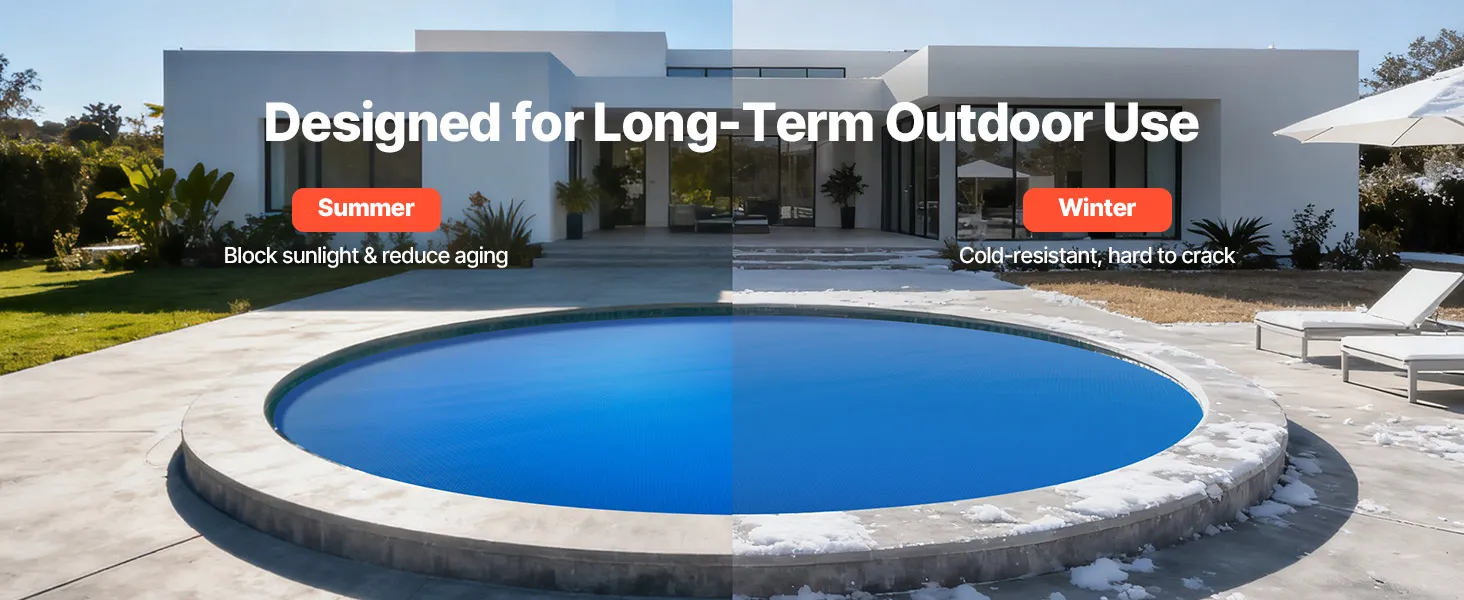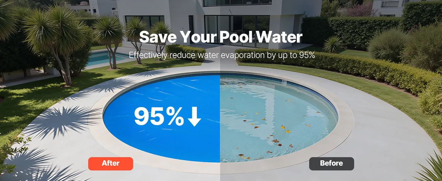 Verlängern Sie die Poolsaison: Unsere φ7315 mm und 0,3 mm (12 mil) dicke Solarplane hält Ihren Pool länger auf angenehmer Temperatur und verlängert so Ihre Badesaison. Schluss mit kalten Poolsprüngen! Einfach zu installieren und individuell auf unregelmäßige Poolformen zuschneidbar.