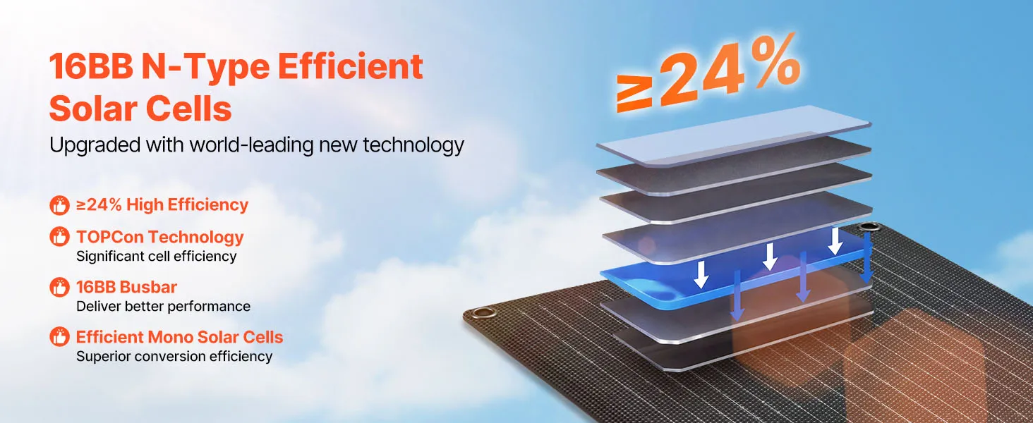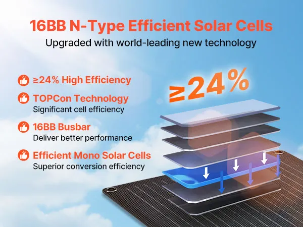 Ausgestattet mit 16BB N-Typ hocheffizienten monokristallinen Solarzellen und einem Wirkungsgrad von ≥24% fängt dieses Solarpanel mehr Sonnenlicht ein und gewährleistet eine stetige, konstante Energieabgabe, um Ihre Geräte mit Strom zu versorgen.