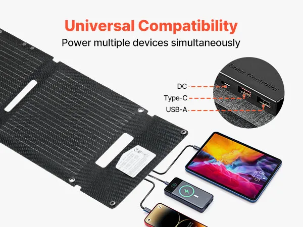 Gleichzeitiges Laden mehrerer Geräte: Ausgestattet mit je einem USB-A-, USB-A (QC3.0)- und Typ-C-Anschluss unterstützt dieses tragbare Solarmodul das gleichzeitige Laden von Handy, Tablet oder Powerbank und hält Ihre wichtigsten Geräte bei Outdoor-Abenteuern mit Strom versorgt