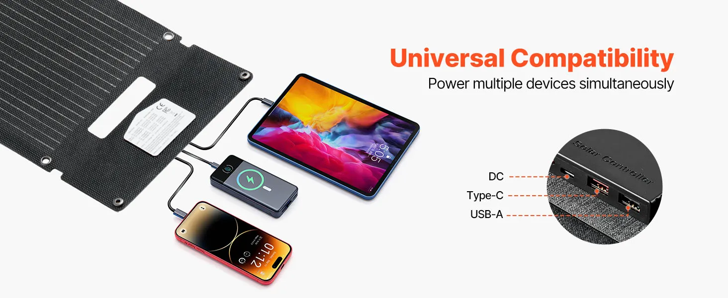 Laden Sie bis zu drei Geräte gleichzeitig über USB-A-, USB-A (QC3.0)- und USB-C-Anschlüsse. Die effiziente Stromversorgung gewährleistet ein reibungsloses Laden von Smartphone, Tablet und Powerbank während Ihres Campingausflugs oder Ihrer Reise.