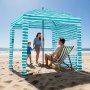 Strandcabana (183 x 183 cm): Diese geräumige Strandcabana mit Seitenvorhang bietet bequem Platz für zwei Personen, Stühle und Gepäck. Dank der praktischen Aufbewahrungstaschen sind Handy, Sonnenbrille und Sonnencreme stets griffbereit