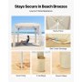 Jede Ecke des einfach aufzubauenden Strandzeltes ist mit Sandsäcken und Heringen für sicheren Halt ausgestattet. Auch die Seitenwand verfügt über Sandsäcke, die ein Wegwehen verhindern und durch das Gewicht des Sandes die Stabilität erhöhen.