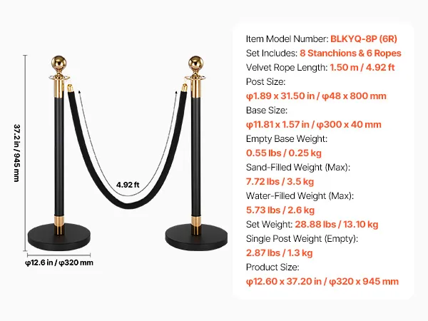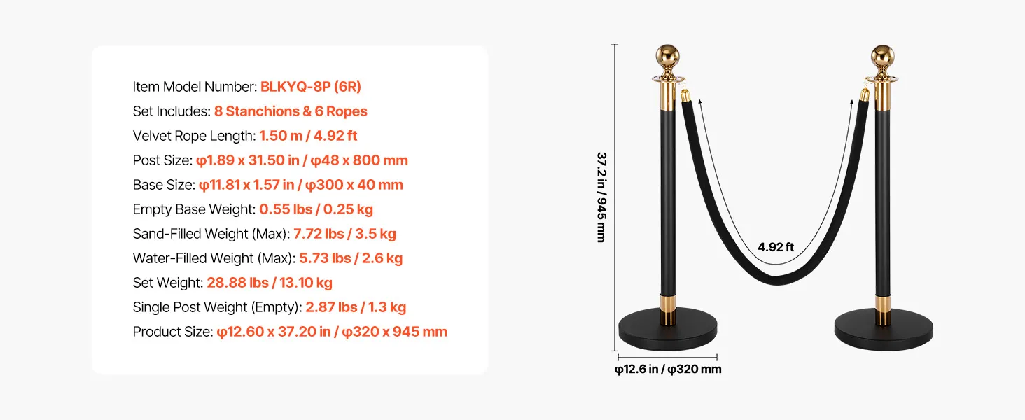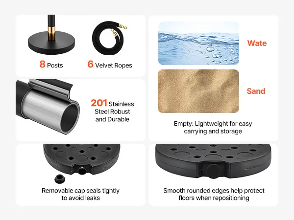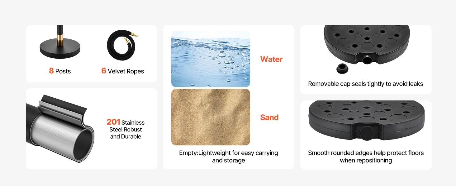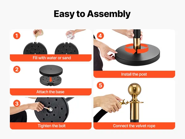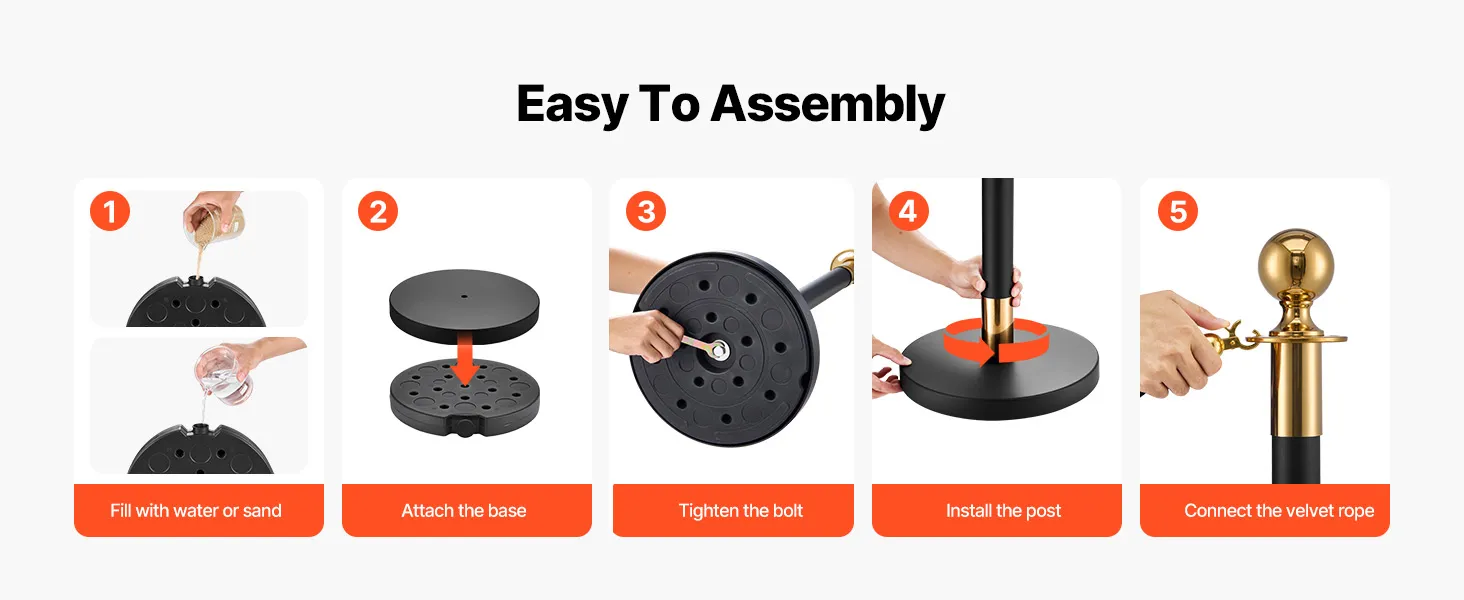 Schnelle Montage: Kein Werkzeug erforderlich! Füllen Sie die Ständer einfach mit Sand oder Wasser, schrauben Sie den Sockel fest, und schon sind Ihre Samtseile und Ständer einsatzbereit. Einfach aufzubauen und noch einfacher zu verwenden, wann immer Sie es brauchen