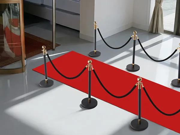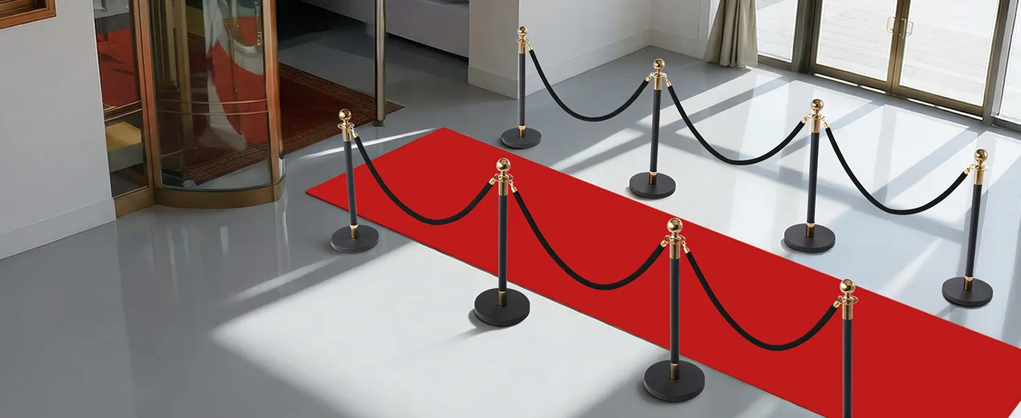 Absperrpfosten mit Samtseilen: Unsere Absperrpfosten mit dicken Samtseilen und einer edlen Metalloberfläche bieten eine zuverlässige Besucherlenkung und verleihen Ihrem Eingang im Handumdrehen ein hochwertiges, festliches Ambiente