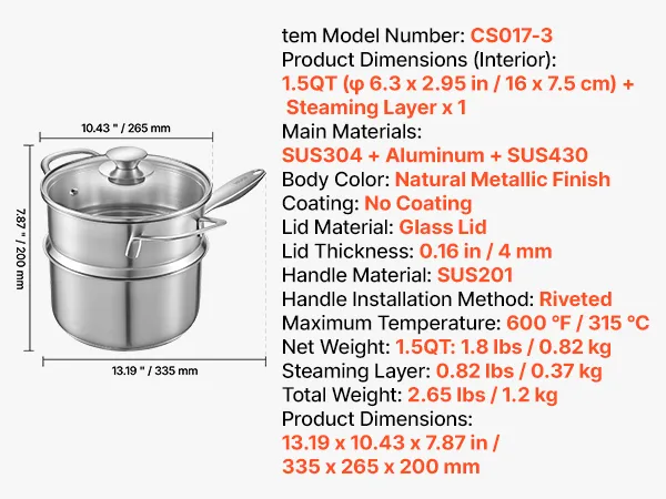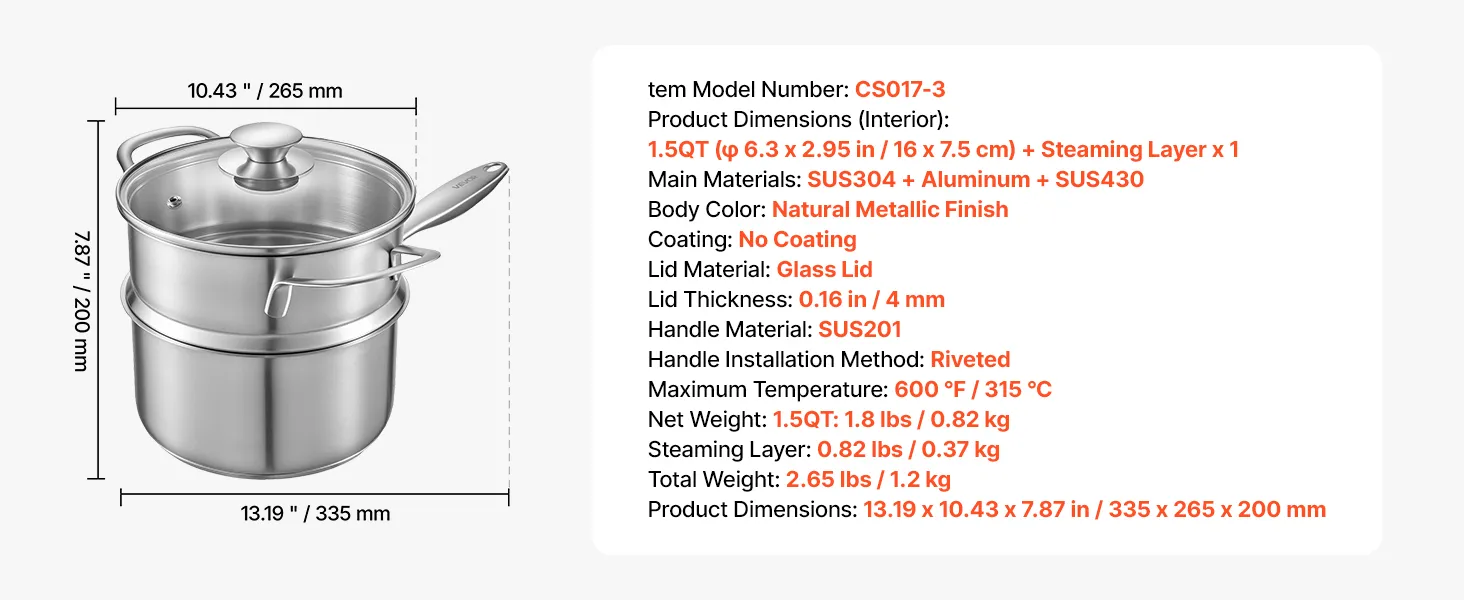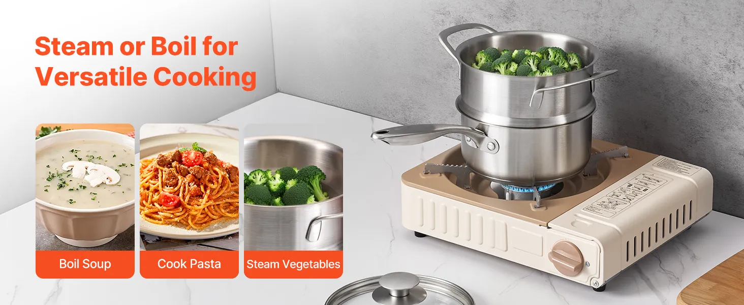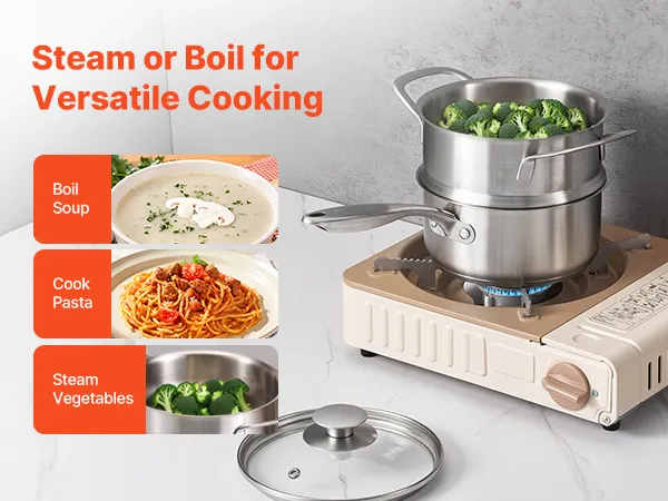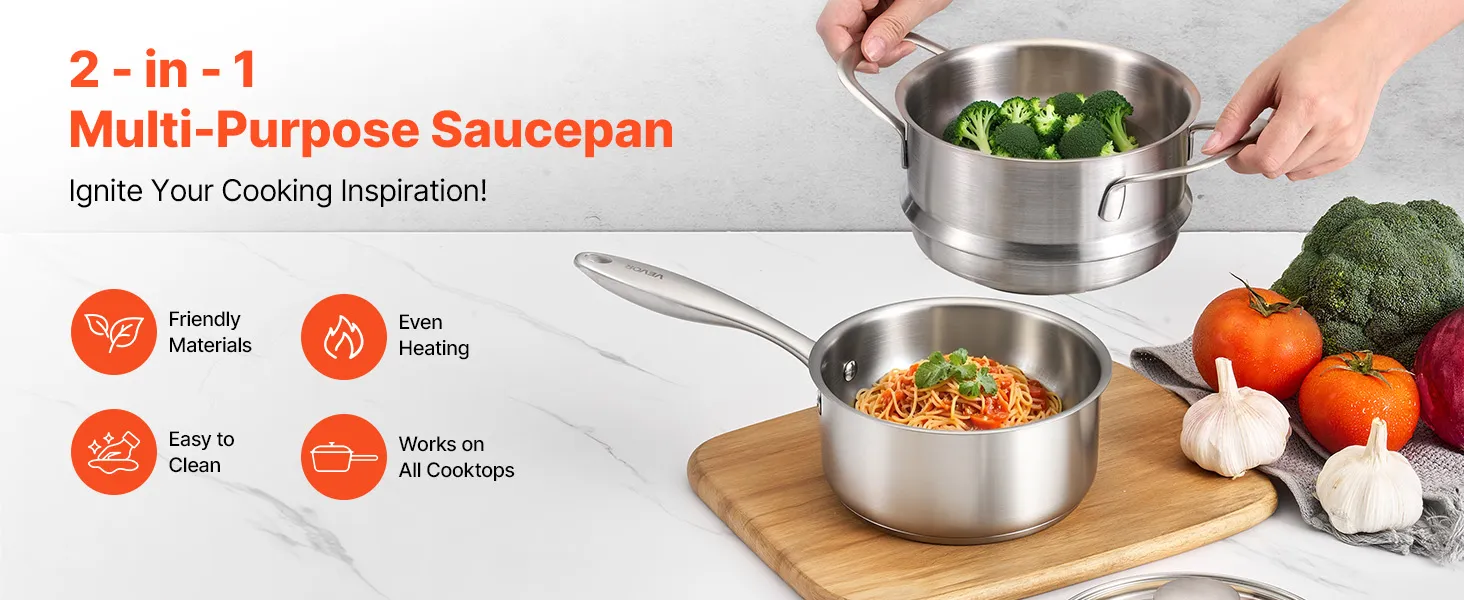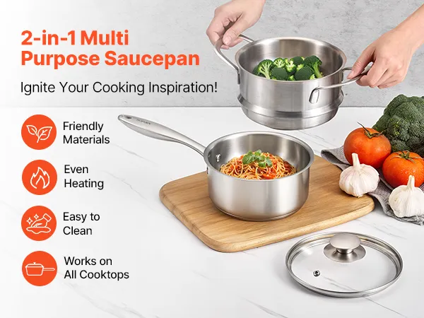 2 in 1 Kochtopf mit Dampfgarer: Dieser 1,5 QT (1,42 L) Kochtopf verfügt über einen Dampfgarer-Einsatz und eignet sich daher nicht nur ideal zum Kochen von Soßen, Suppen und Milch, sondern auch zum Dämpfen von Meeresfrüchten und Gemüse. Eine vielseitige Lösung für alltägliche Mahlzeiten