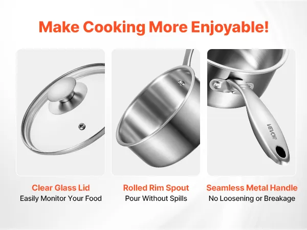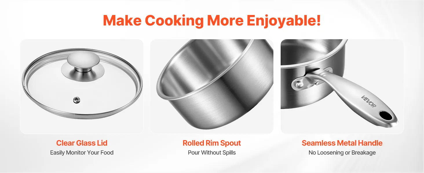 Unser Edelstahltopf verfügt über einen verdickten, transparenten Glasdeckel zur Überwachung des Kochvorgangs. Der ausgestellte Rand ermöglicht tropffreies Ausgießen von Suppe und Milch. Der genietete, einteilige Metallgriff sorgt für Langlebigkeit und verhindert ein Lösen oder Brechen während des Gebrauchs.