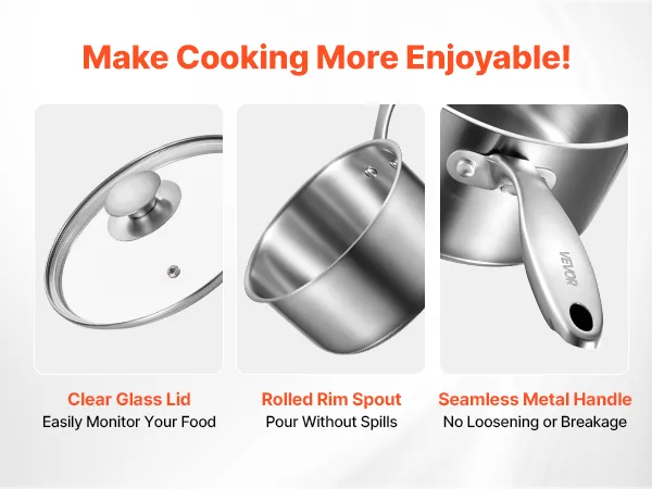 Unser Edelstahltopf verfügt über einen verdickten, transparenten Glasdeckel zur Überwachung des Kochvorgangs. Der ausgestellte Rand ermöglicht tropffreies Ausgießen von Suppe und Milch. Der genietete, einteilige Metallgriff sorgt für Langlebigkeit und verhindert ein Lösen oder Brechen während des Gebrauchs.