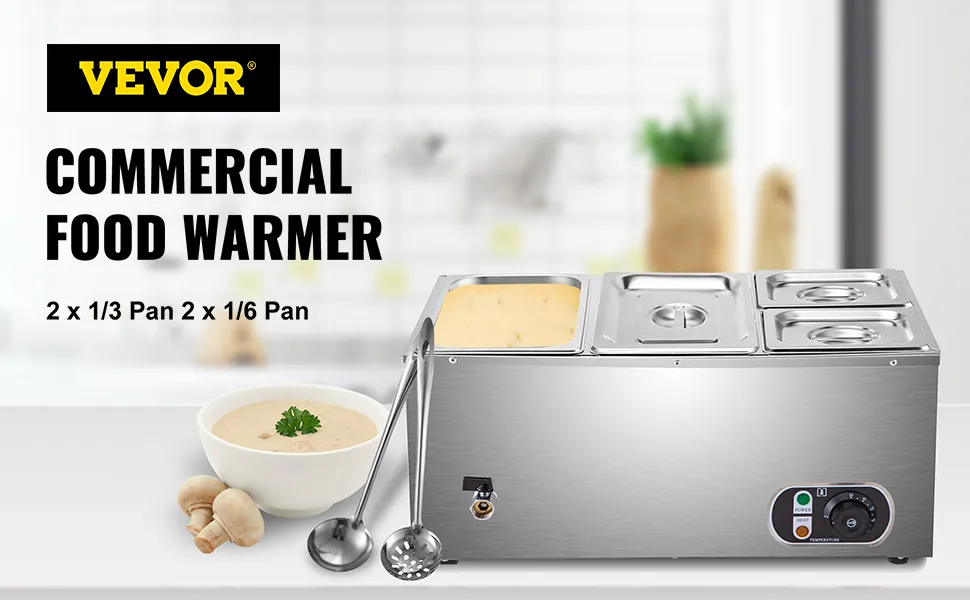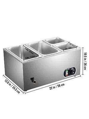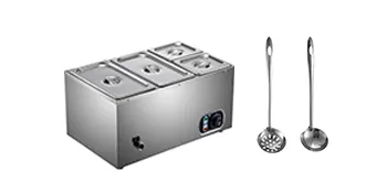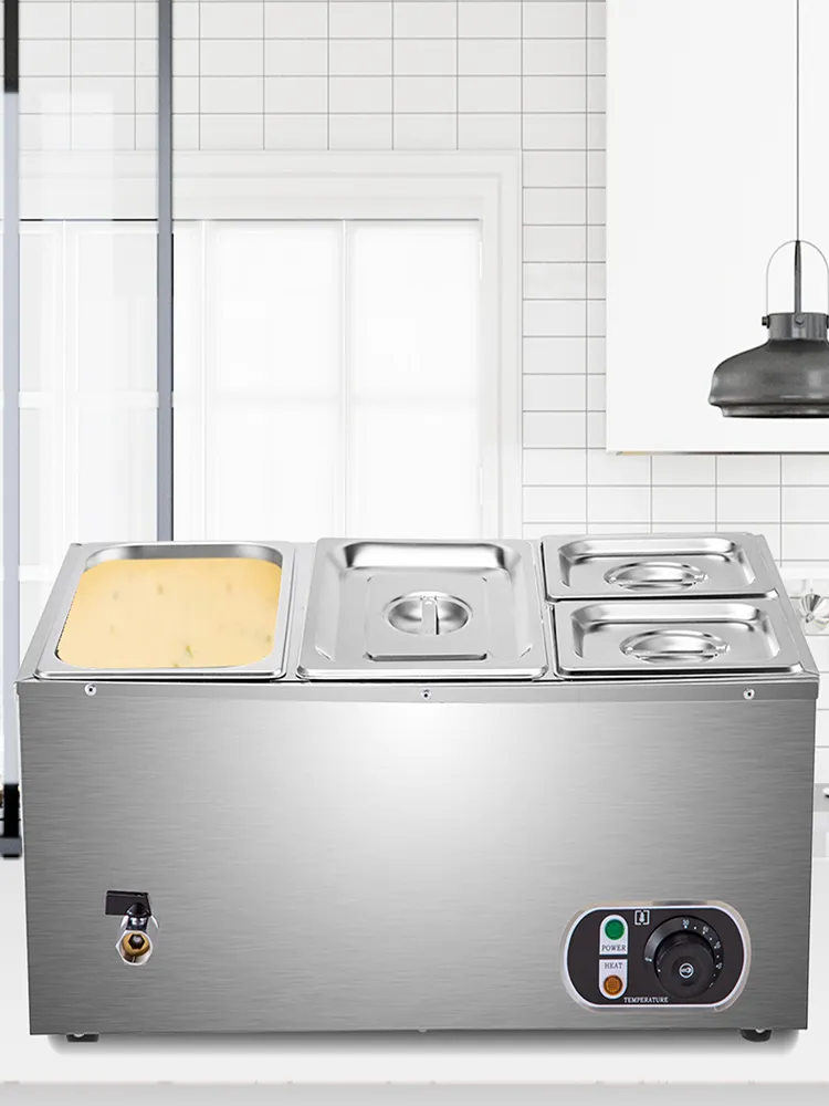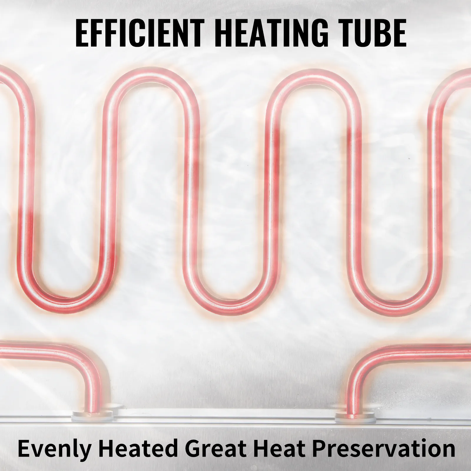 Der Speisewärmer des Restaurants, einschließlich vier Pfannen und Deckel, besteht aus eingedicktem Edelstahl in Lebensmittelqualität und ist langlebig und leicht zu reinigen. Die konstante Temperaturregelung (30-85 °C) hält das Geschirr nach Ihren Wünschen warm. Die Speisewärmer werden häufig verwendet, um Gerichte in Frühstücksgeschäften, Imbissstuben, Restaurants, Schulcafeterias usw. warmzuhalten.