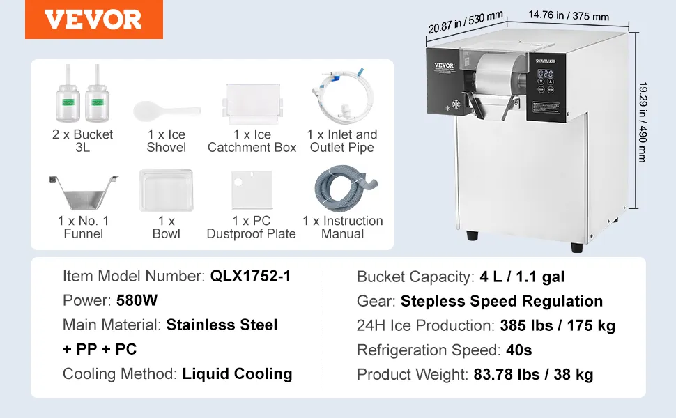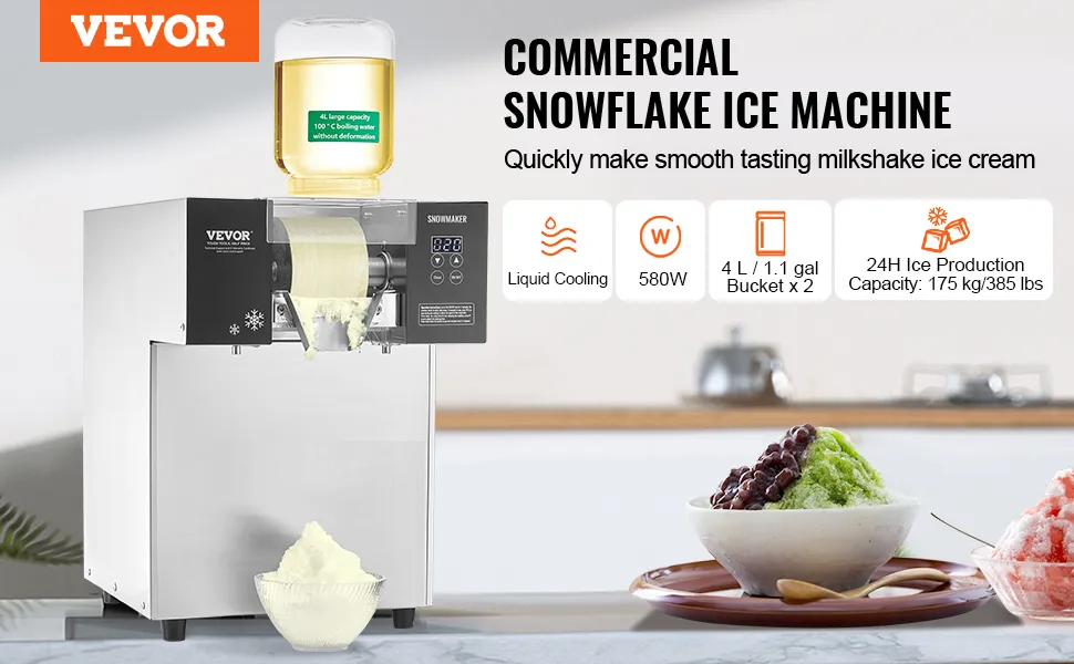Effiziente & kontinuierliche Eisproduktion: Die Schneeflocken-Eismaschine verfügt über ein leistungsstarkes, stabiles Flüssigkeitskühlsystem, das eine schnelle Abkühlung in 40 Sekunden erreicht und nach der Vorkühlung in nur 3 Sekunden Eis produziert. Sie kann ungefähr 385 lbs (175 kg) Eis pro Tag produzieren und ist ideal für die Herstellung verschiedener Getränke wie zuckerhaltiger Getränke, alkoholischer Getränke mit einem Alkoholgehalt von weniger als 10°, Fruchtsaftgetränke und Milch.
