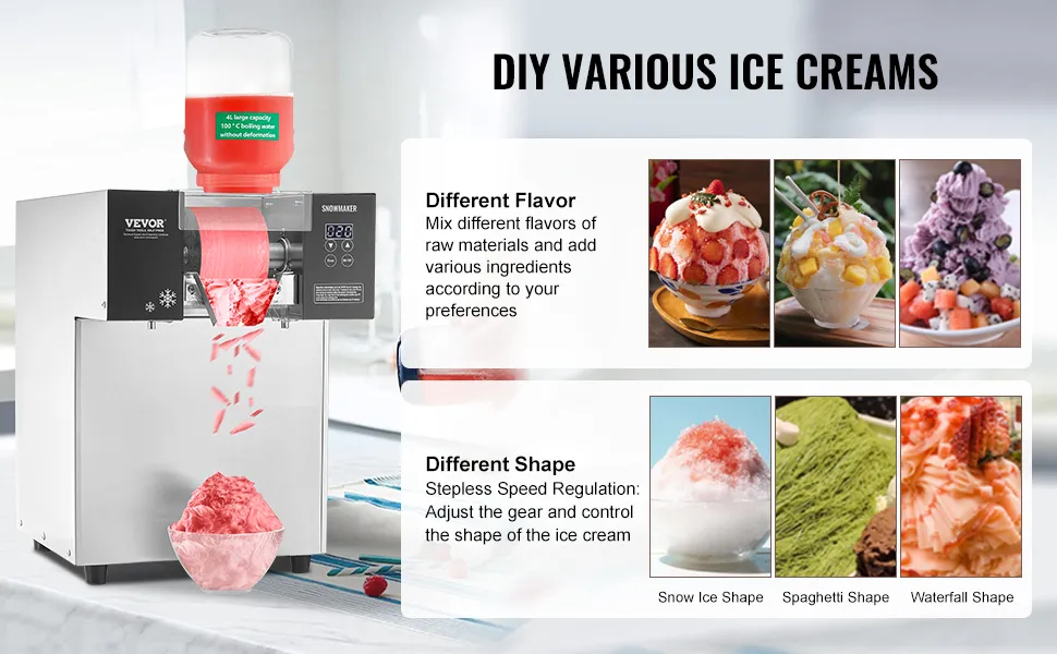 Verschiedene Eisformen: Durch Anpassen der Walzengeschwindigkeit erzeugt diese Schneeflockeneismaschine Eiscreme in verschiedenen Texturen, beispielsweise in Schneeeisform, Spaghettiform und Wasserfallform, die jeweils eine samtig-glatte Textur bieten.
