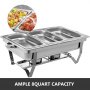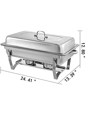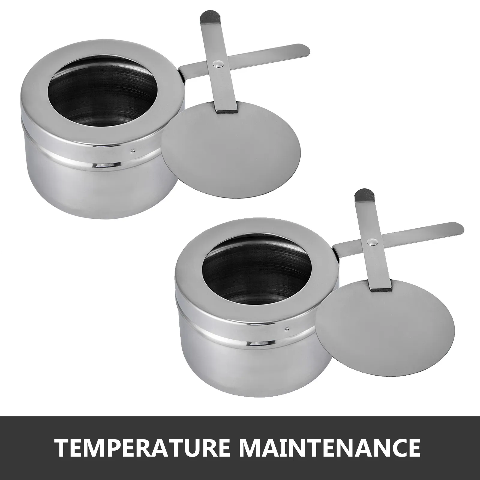 Zwei Brennbehälter dienen zum Erwärmen des Essen. Im Allgemeinen können 25g alkoholischer Festbrennstoff etwa eine halbe Stunde dauern. Wenn der Brennstoff gelöscht ist, hält die Speisen ca. 3-4 Stunden warm. Sie können auch Eis in die Wasserschale stellen, wenn Sie das Essen kühlen möchten