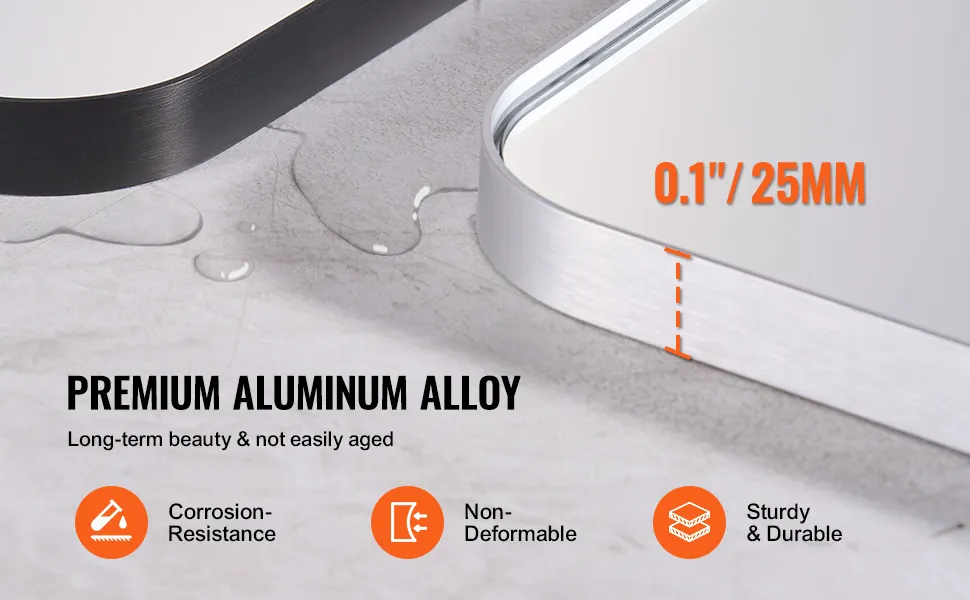 Der leichte Spiegelrahmen aus einer hochwertigen Aluminiumlegierung ist korrosionsbeständig und behält seinen Glanz auch in feuchten Räumen wie Badezimmern. Er bietet eine lange Lebensdauer und ein elegantes, modernes Aussehen.