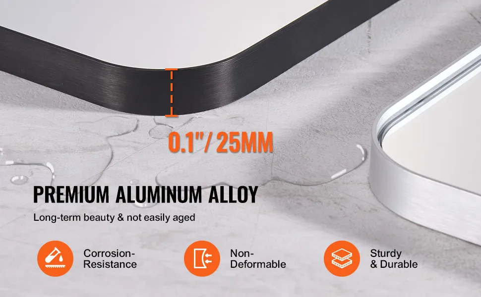Der leichte Spiegelrahmen aus einer hochwertigen Aluminiumlegierung ist korrosionsbeständig und behält seinen Glanz auch in feuchten Räumen wie Badezimmern. Er bietet eine lange Lebensdauer und ein elegantes, modernes Aussehen.