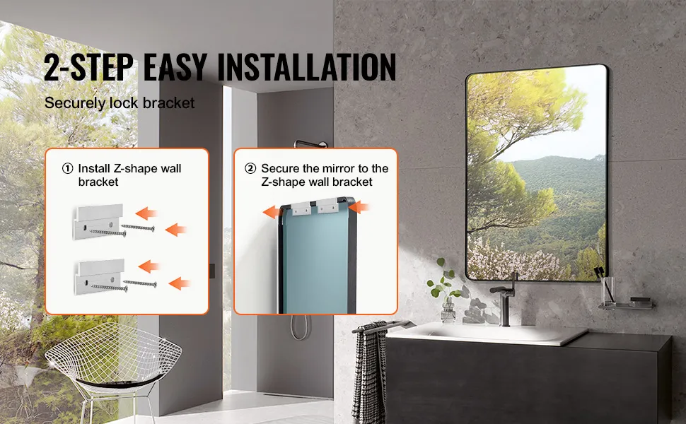 Die Z-förmige Wandhalterung dieses an der Wand befestigten Schminkspiegels vereinfacht die Installation und minimiert die Notwendigkeit, Löcher zu bohren oder die Wand zu beschädigen. In nur zwei einfachen Schritten ist der Spiegel sicher befestigt.