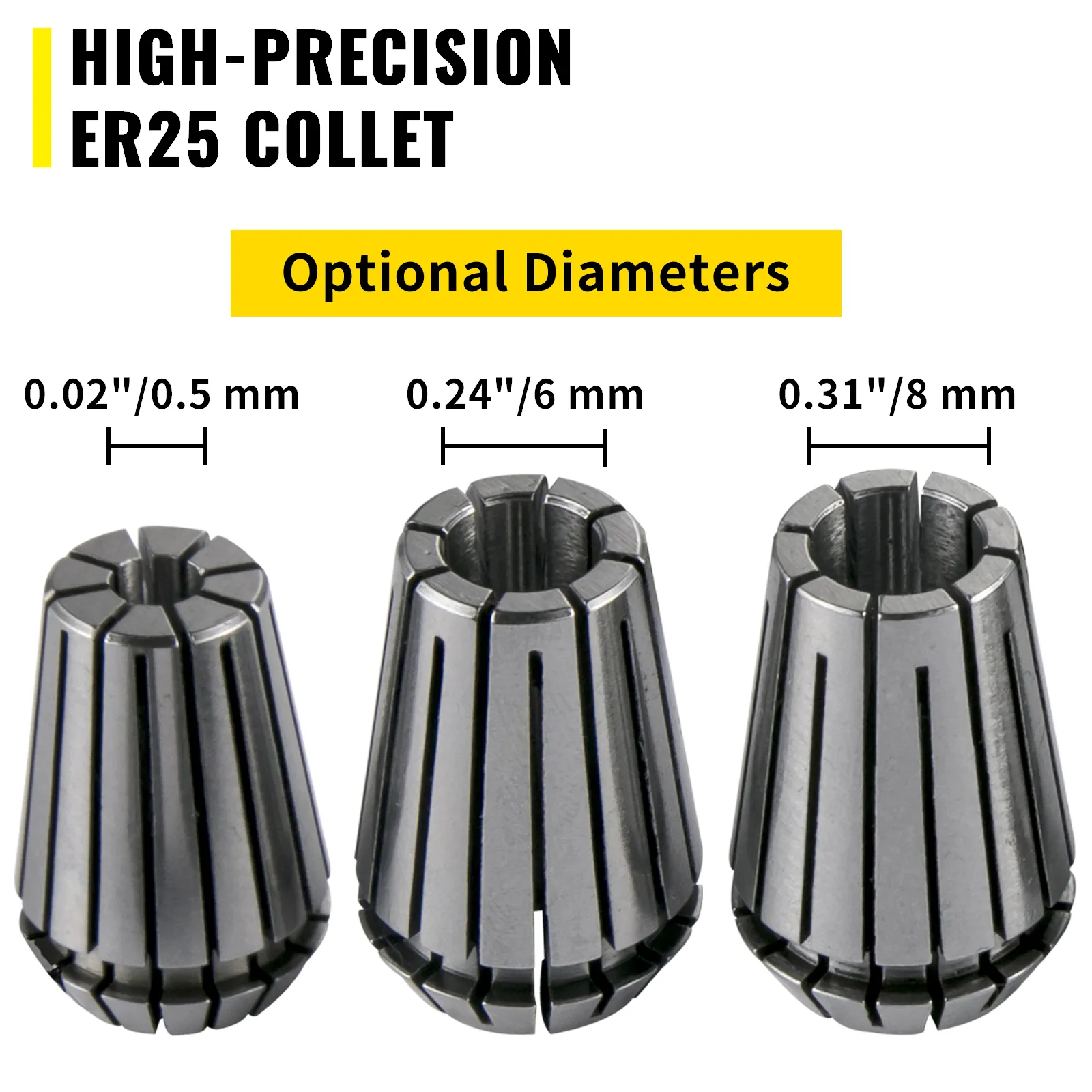 Für Ihre Bequemlichkeit stellen wir Ihnen drei ER25-Spannzangen (φ6 mm, 8 mm, 0,5 mm) zur Verfügung, um Ihre unterschiedlichen Schnitzanforderungen zu erfüllen. Die Spannzangenmutter besteht aus Manganstahl, um ein Brechen des Schaftfräsers zu verhindern.