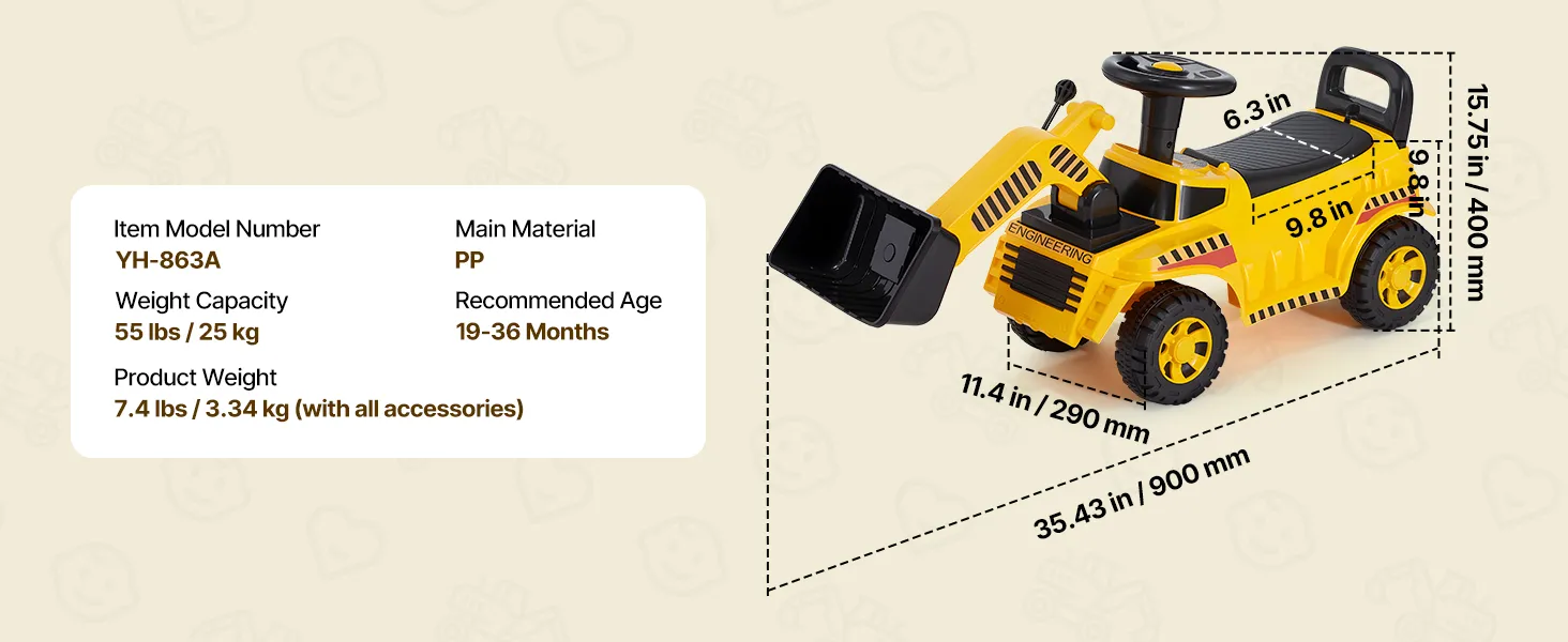 VEVOR Sitzbagger, Kinderbagger, Bagger-Bulldozer-Spielzeug mit Kippschutz und Stauraum unter dem Sitz, Aufsitzbagger 25 kg Tragkraft, Lauflernhilfe für Kleinkinder von 19 bis 36 Monaten, Gelb