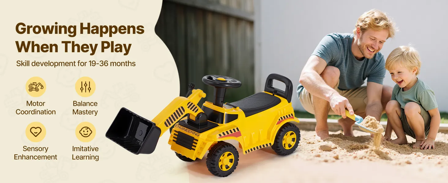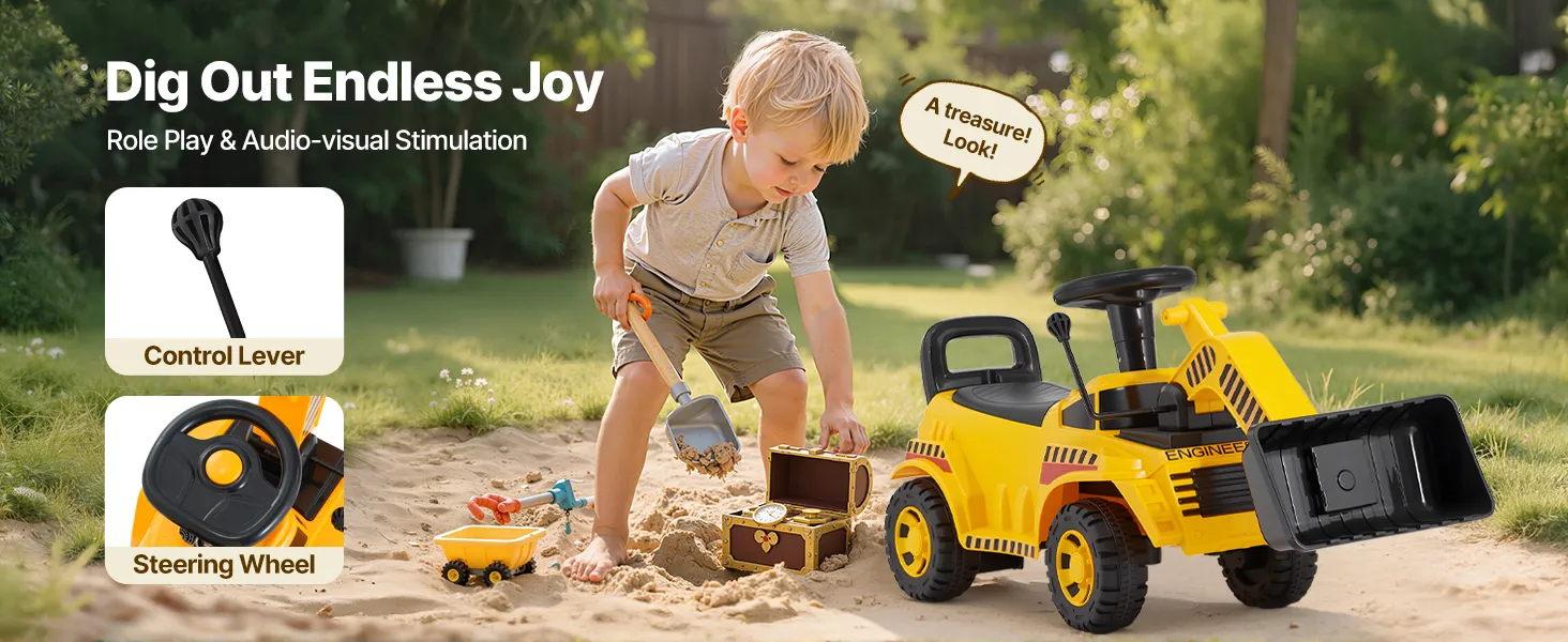 Mini-Kranführer: Steuern Sie die Schaufel, drehen und laden Sie sie, während Sie das Lenkrad lenken. Mit dem „Tuck-Tuck“-Motorgeräusch wirkt unser Rutschauto wie ein echter Kran! Diese lustige Aktivität fördert die Hand-Augen-Koordination und die sensorische Entwicklung.