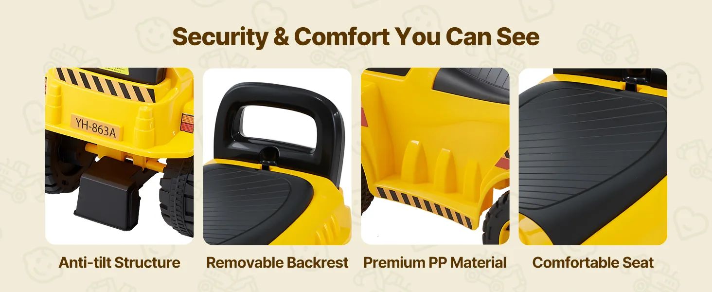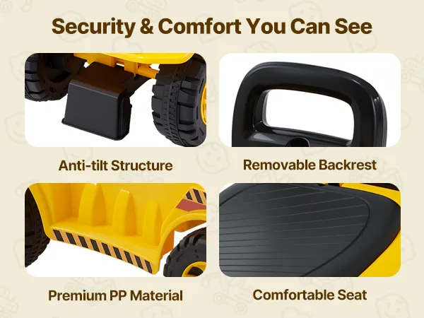 Dreifacher Sicherheitsschutz: Das aus strapazierfähigem PP-Material gefertigte Sitzbagger für Kleinkinder trägt bis zu 25 kg und verfügt über ein Anti-Kipp-Design und eine Rückenlehne, um ein Wackeln zu vermeiden und für Sicherheit zu sorgen.