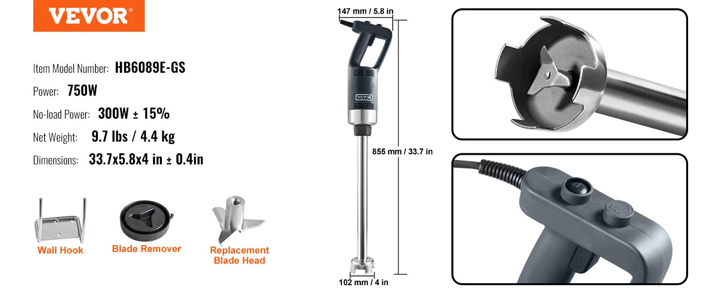 Leicht zu zerlegen & zu reinigen: Das abnehmbare Design ermöglicht eine einfache Drehung, um den Griff, den Mixfuß und anderes Zubehör zu montieren oder zu demontieren. Das Messer des Industriemixers kann in der Spülmaschine gereinigt werden.