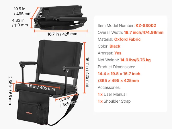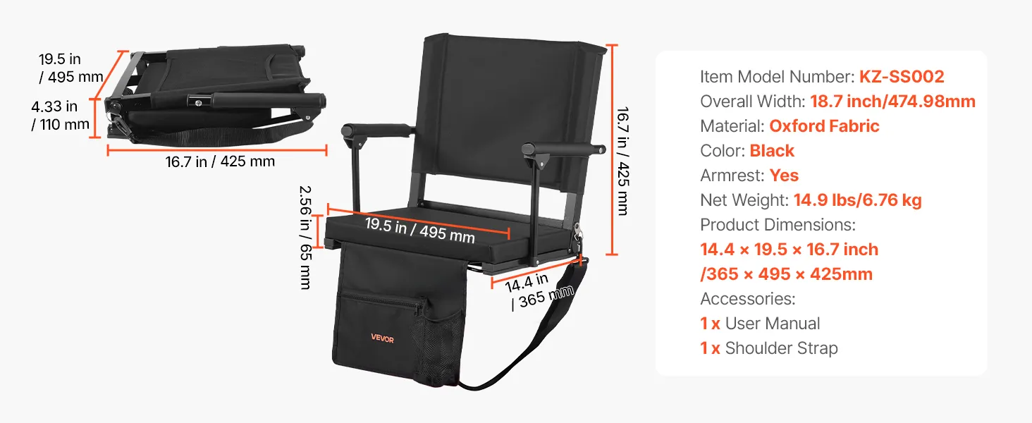 Breiter Sesselkomfort: Dieser tragbare Tribünensitz besteht aus einem leichten Stahlrahmen, dickem, hochdichtem Schaumstoff und wasserdichtem 600D Oxford-Gewebe. Die 95°-Rückenlehne bietet gepolsterten Halt, während der 482,6 mm breite Sitz mit Armlehnen den meisten Benutzern bequemes Zuschauen bei Sportveranstaltungen ermöglicht.