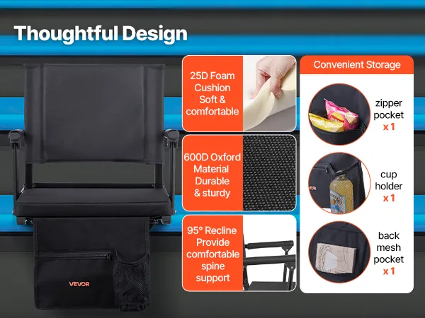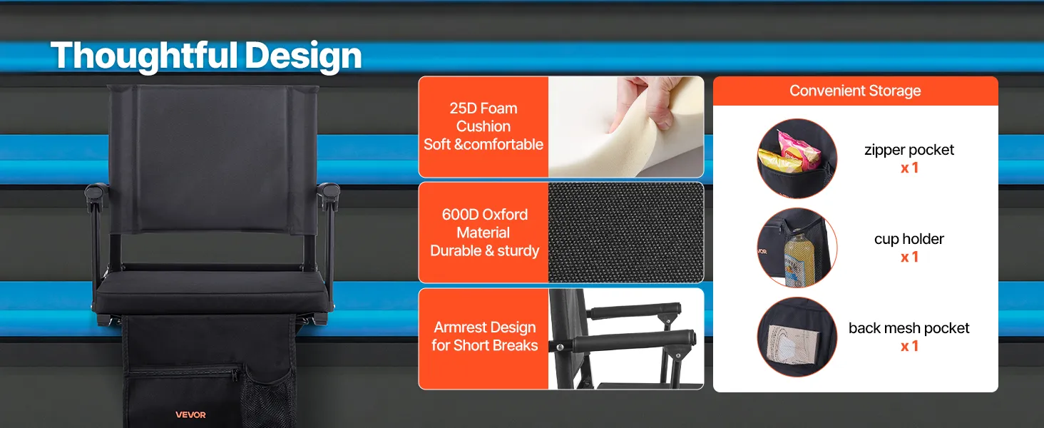 Verbessern Sie Ihr Outdoor-Erlebnis mit diesem Tribünensitz mit Rückenlehne, der mit mehreren Aufbewahrungstaschen für Ihr Telefon, Getränke, Snacks und Taschentücher ausgestattet ist. Der leichte Stahlrahmen, der hochdichte Schaumstoff und das wasserfeste 600D Oxford-Gewebe sorgen für Langlebigkeit und Komfort.