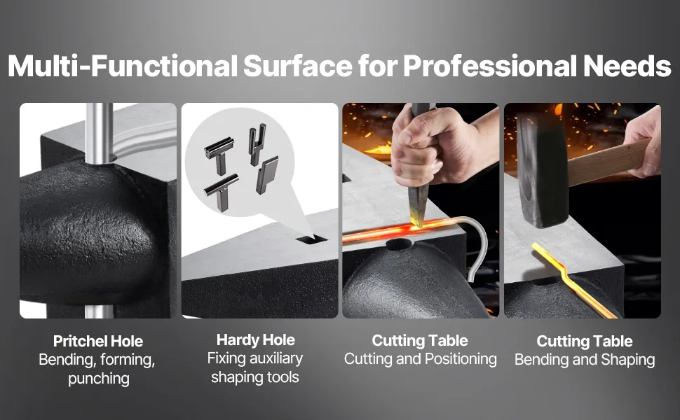 Das abgerundete Horn und das flache Horn werden zum sanften Biegen und Formen verwendet; Pritchel-Loch und Hardy-Loch dienen zum Zuschneiden, Stanzen und Biegen.