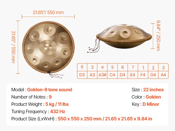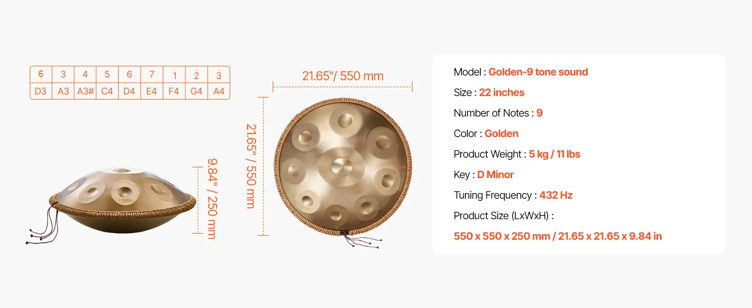 550 mm (22-Zoll)-Handtrommel, 9 Töne in D-Moll: Mit 9 Tönen in D-Moll und einer Tonhöhe von 432 Hz eignet sich unsere Handtrommel ideal zum Spielen einfacher Anfängerstücke bis hin zu anspruchsvollen Kompositionen. Sie wird mit einem 550 mm (22 Zoll) Korpus und einer Tragetasche geliefert und ist leicht und einfach zu transportieren.