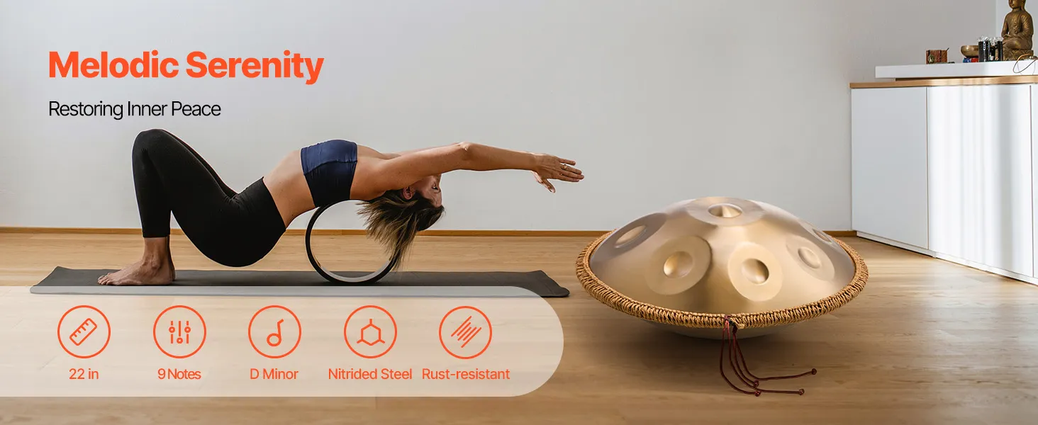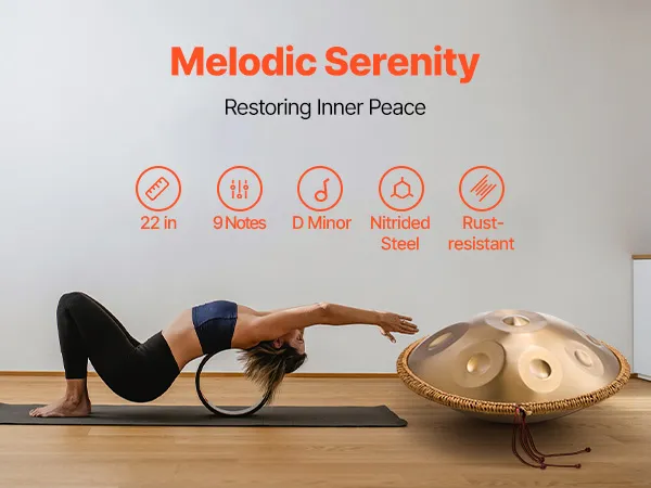 Unsere Handpan-Trommel ist aus nitriertem Stahl gefertigt und daher robust und langlebig. Dank ihrer feinfühligen Resonanz wirkt ihr ätherischer und angenehmer metallischer Klang beruhigend auf Körper und Geist, entspannt die Nerven, lindert Stress und steigert das emotionale Wohlbefinden.