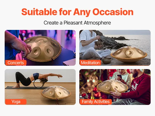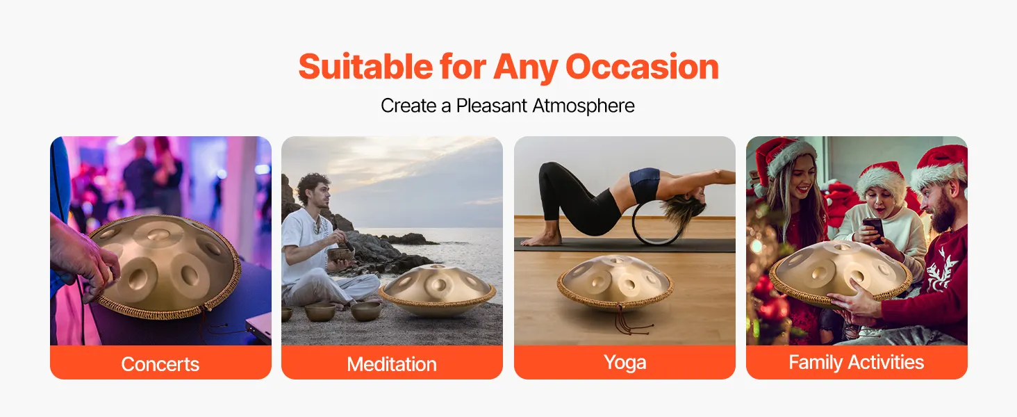 Vielseitige Anwendungsmöglichkeiten: Unsere Handpan-Trommel erzeugt eine beruhigende Melodie, die Stress abbaut, die Emotionen beruhigt und innere Ruhe schenkt. Sie eignet sich für Yoga-Meditation, Musikunterricht, Zen-Praxis, Musiktherapie, religiöse Veranstaltungen und vieles mehr.