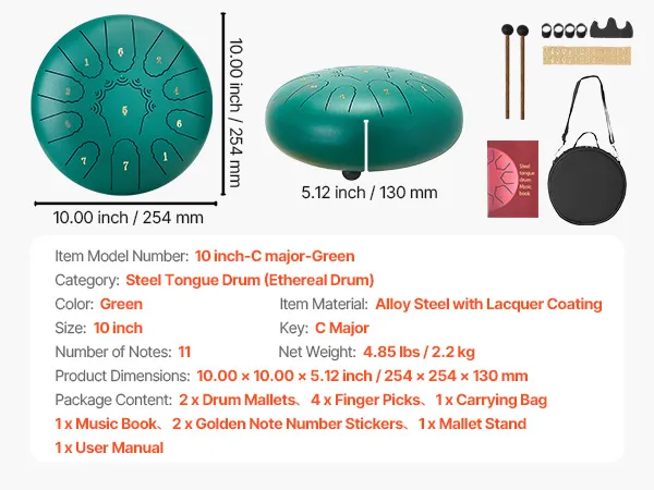 254 mm (10 Zoll) C-Dur-Drum mit 11 Tönen: Unsere Stahlzungentrommel in C-Dur mit 11 Tönen eignet sich für einfache Stücke für Anfänger bis hin zu komplexen Kompositionen für Profis. Sie wird mit einem 254 mm (10 Zoll) Korpus und einer Tragetasche geliefert und ist leicht und einfach zu transportieren.