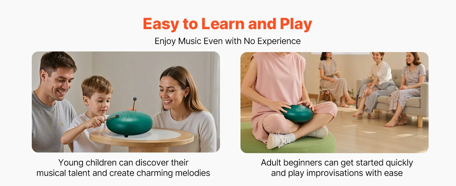 Keine musikalischen Vorkenntnisse oder Spielerfahrung erforderlich. Einfach mit unserer Regentrommel im Freien trommeln und schon erklingen angenehme Melodien. Dank der einfachen Bedienung und des flexiblen Rhythmus können Kinder und Erwachsene sofort den Zauber der Musik erleben. Ideal für Musikanfänger.