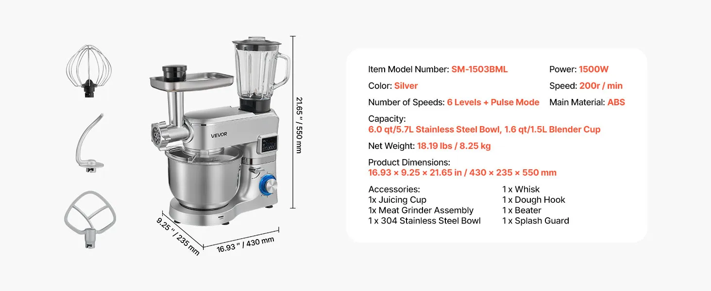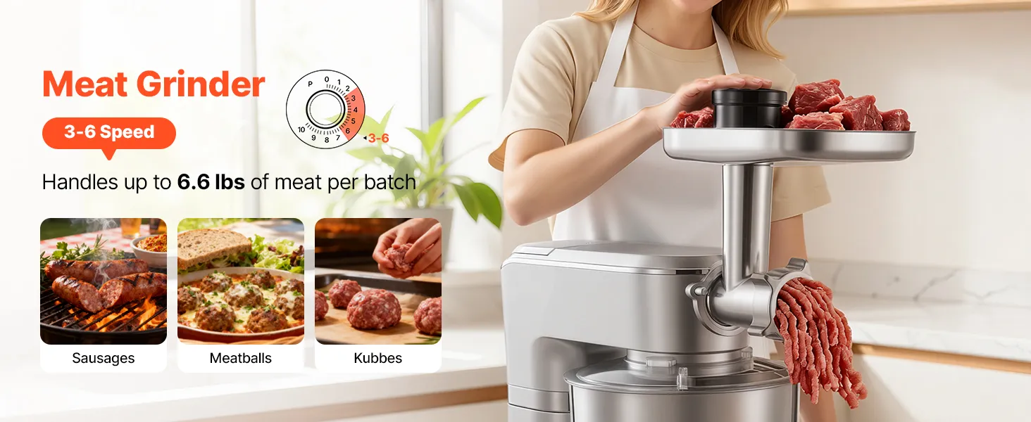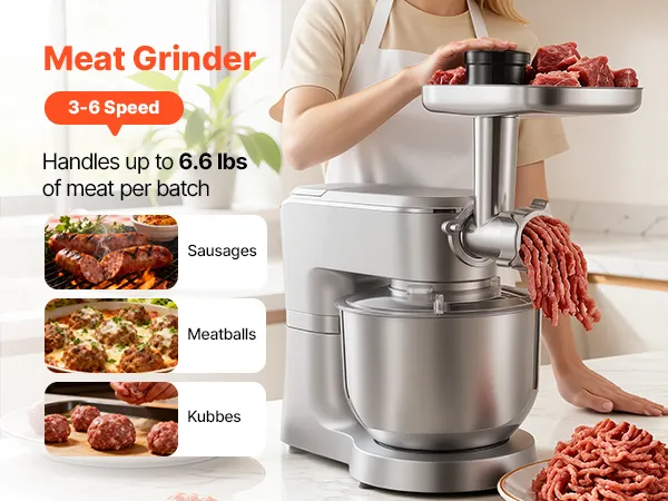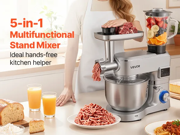 5 in 1 Küchenmaschine: Unsere Küchenmaschine vereint 5 Werkzeuge in einem für mühelose Zubereitung. Sie verfügt über einen Knethaken zum Kneten, einen Schneebesen zum Schlagen und einen Rührbesen für vielseitige Mixaufgaben. Nutzen Sie außerdem den Fleischwolf für Würstchen und Burger und den 1,6 Qt (1,5 L) Saftmixer für frische Smoothies