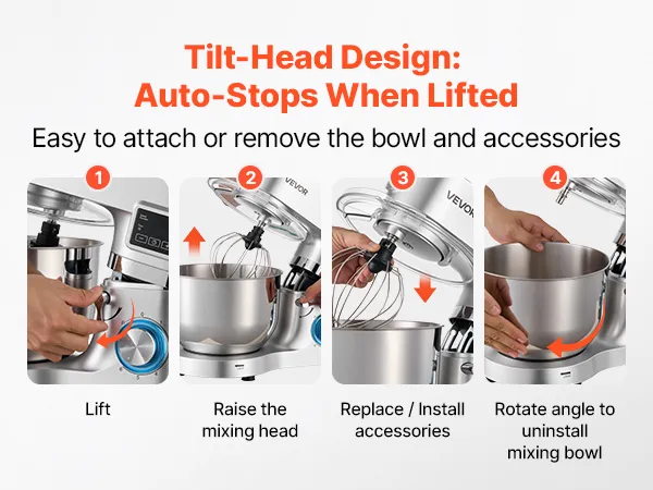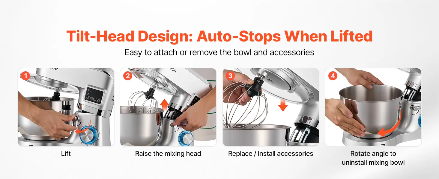 Leicht abnehmbar & zu reinigen: Der Kippkopf stoppt beim Anheben automatisch und ermöglicht so ein einfaches Anbringen und Abnehmen der Mixwerkzeuge. Zum Abnehmen die Schüssel drehen und anheben. Das Zubehör, bestehend aus Schüssel, Haken und Stab, ist aus lebensmittelechtem Edelstahl gefertigt und spülmaschinenfest