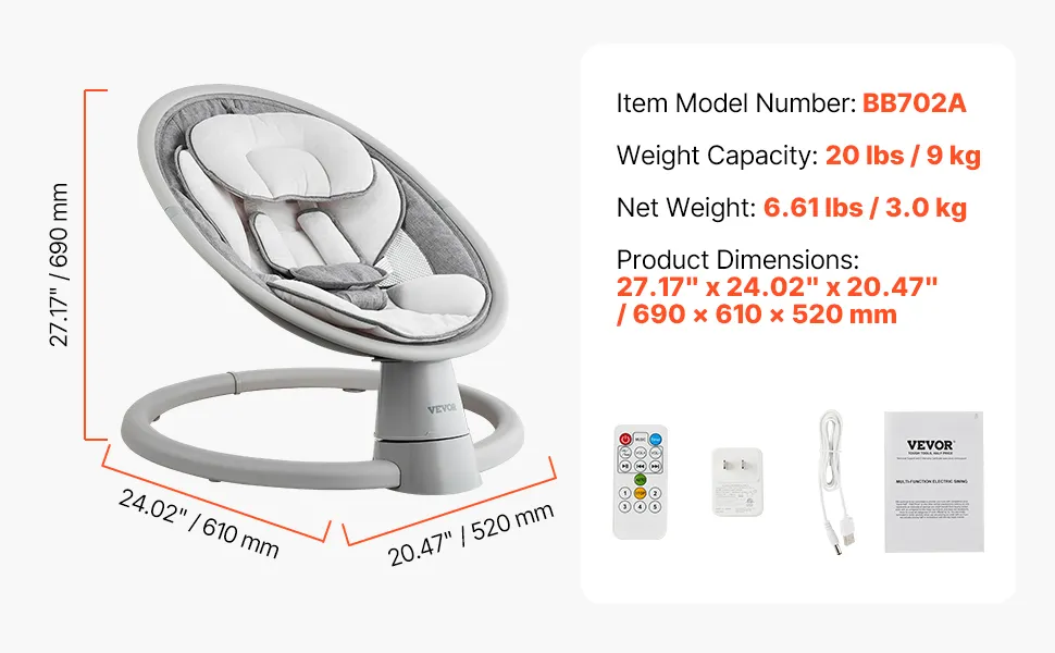 Mit einem Gewicht von nur 3,7 kg lässt sich diese Babyschaukel leicht zusammenfalten. Sie wird mit 4 AAA-Batterien (nicht im Lieferumfang enthalten), USB oder Netzteil betrieben und verfügt über ein 2 Meter langes Netzkabel. Sie ist ideal für den Einsatz im Innen- und Außenbereich.