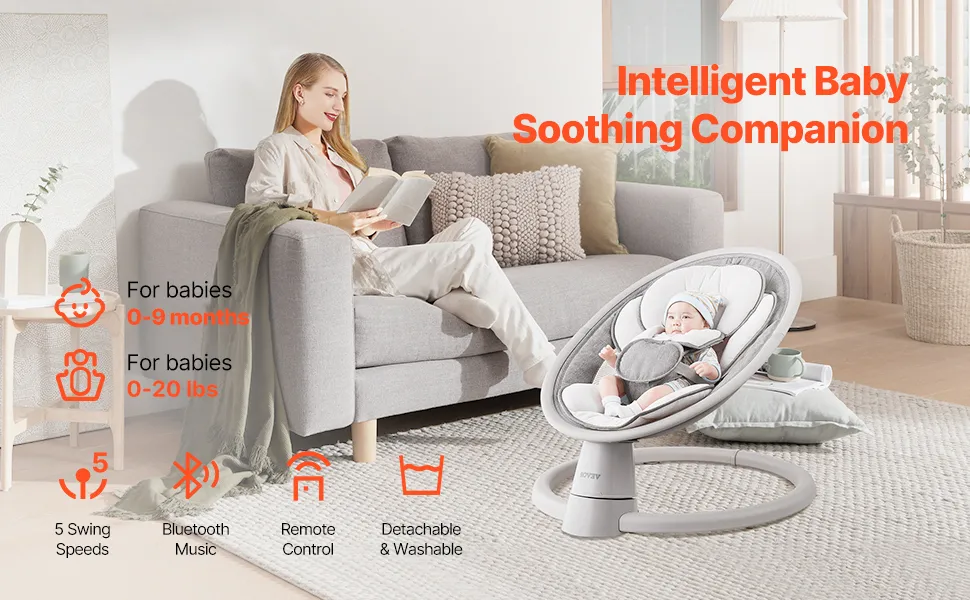 Schaffen Sie mit unserer Babyschaukel einen gemütlichen, beruhigenden Ort für Ihren Kleinen! Mit 5 Schaukelgeschwindigkeiten, Touchpanel, Fernbedienung, Bluetooth-Musik, 10 Liedern und 5-Punkt-Sicherheitsgurt ist sie ideal für Babys von 0 bis 9 Monaten oder bis zu 9 kg.