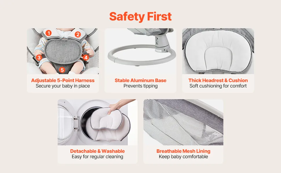 Sicherheit geht vor, Spaß für immer: Unser Babyschaukelstuhl verfügt über eine einteilige runde Aluminiumbasis für verbesserte Stabilität und eine Sitzwinkelverriegelung für zusätzliche Sicherheit. Der 5-Punkt-Gurt hält Ihr Baby sicher, während verstellbare Schulterpolster zusätzlichen Komfort bieten