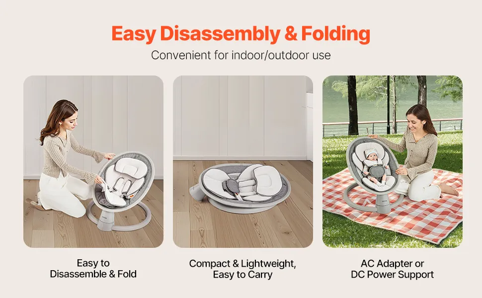 Tragbar und reisefreundlich: Diese kompakte Babyschaukel für Neugeborene wiegt nur 3,7 kg, lässt sich leicht auseinandernehmen und zusammenfalten und nimmt nur wenig Platz ein. Mit vielseitigen Stromversorgungsoptionen – 4 AAA-Batterien (nicht im Lieferumfang enthalten), Aufladen über USB-Powerbank oder 2 m langes Netzkabel – ist sie ideal für den Einsatz im Innen- und Außenbereich. Nehmen Sie sie überallhin mit und sorgen Sie dafür, dass Ihr Baby sich unterwegs wohl und ruhig fühlt