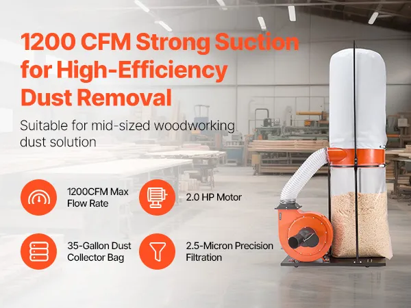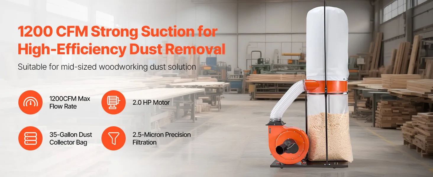 Robuste Staubabsaugung: Mit einem Luftstrom von 2038,8m³/h (1200 CFM) erfasst diese tragbare Absauganlage große und feine Holzpartikel gleichermaßen. Schnelle, leistungsstarke Absaugung reinigt Ihren Arbeitsbereich effizient, verbessert die Luftqualität in der Werkstatt und ermöglicht produktivere und reibungslosere Holzbearbeitungssitzungen