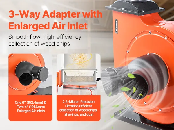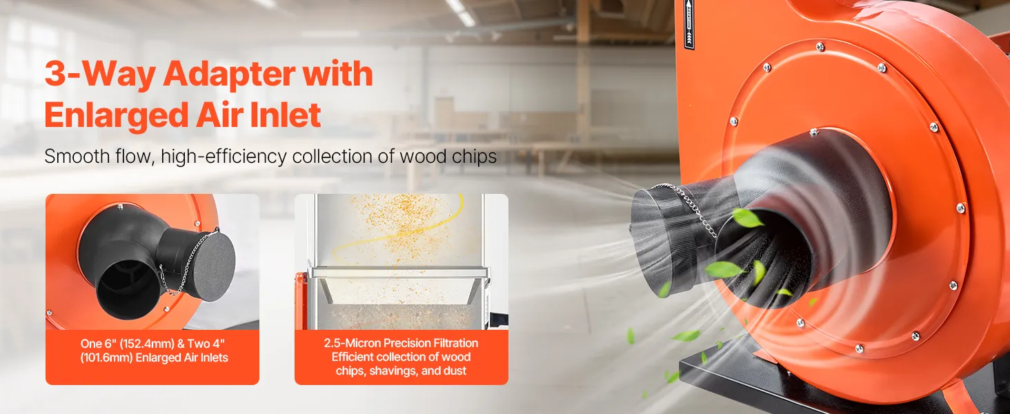 Die 6 Zoll/152,4 mm und zwei 4 Zoll/101,6 mm vergrößerten Ansaugöffnungen dieses Holzstaubabscheiders erhöhen die Saugleistung und saugen Holzstaub und Feinpartikel effektiver ein. Der verbesserte Luftstrom reduziert Verstopfungen durch Schmutzablagerungen, verbessert die Staubabsaugung und sorgt für eine sauberere, übersichtlichere Werkstatt.