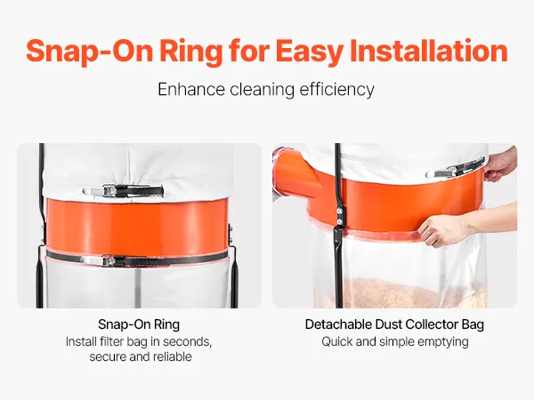 Das Clip-On-Design dieses Staubsammelsystems ermöglicht eine schnelle Filter- und Beutelmontage. Beim Reinigen kann der Auffangbeutel entfernt werden, um den Staub schnell und sauber freizusetzen. Dies ermöglicht eine effiziente Wartung und reduziert Ausfallzeiten für einen reibungsloseren Arbeitsablauf in Ihrer Werkstatt.