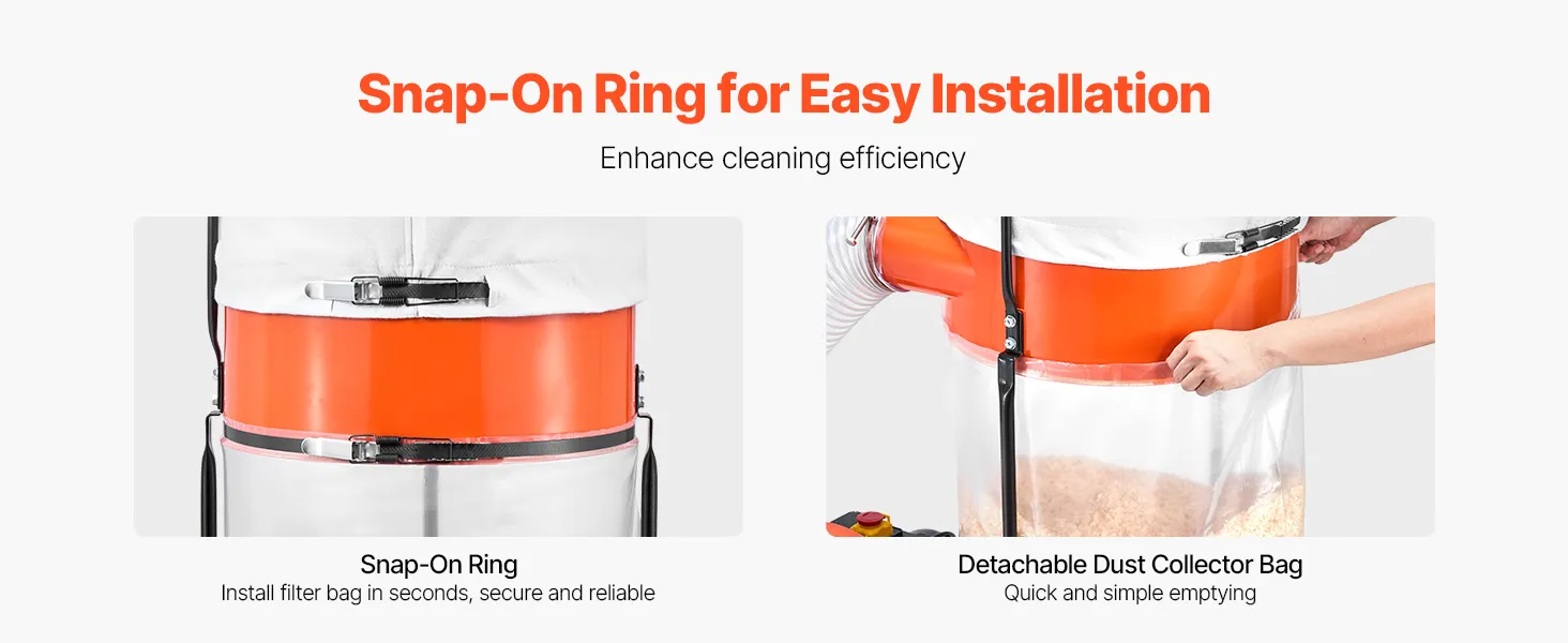 Vereinfachte Beutelreinigung: Dank der praktischen Clip-Halterungen lässt sich der Staubbeutel dieses Holzstaubsammlers in Sekundenschnelle abnehmen und entleeren. Die schnelle Entfernung von Sägemehl und anderen Ablagerungen vereinfacht die Wartung und sorgt für einen organisierten und effizienten Arbeitsplatz bei Holzarbeiten.