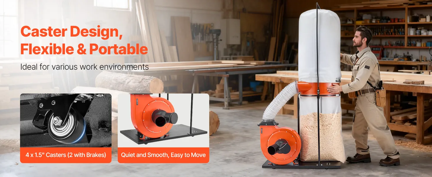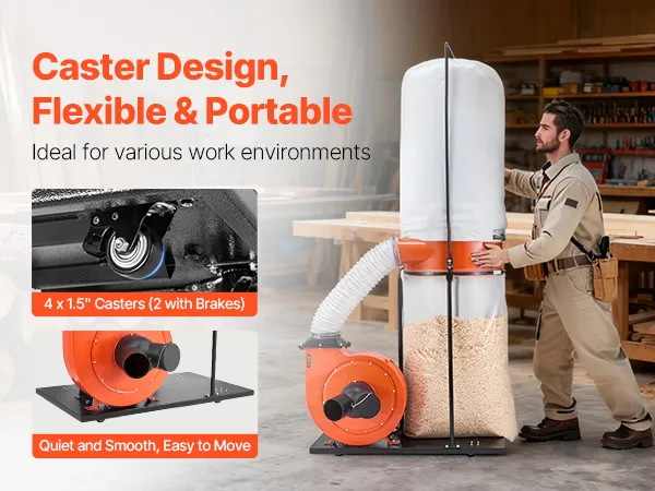 Dieser Staubsauger für die Holzbearbeitung ist mit vier multidirektionalen Rädern ausgestattet und lässt sich problemlos in jeden Bereich Ihrer Werkstatt transportieren. Seine Mobilität vereinfacht die Neupositionierung, ermöglicht eine effizientere Staubabsaugung und bietet Komfort bei Holzbearbeitungsarbeiten jeder Größenordnung.