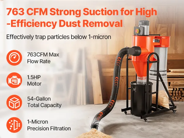 Hohe Saugleistung: Mit einem Luftstrom von 1296,337 m³/h (763 CFM) sorgt dieser Staubsauger für die Holzbearbeitung für eine robuste und stabile Saugleistung. Er entfernt schnell grobe Holzspäne und feinen Staub, sorgt für eine saubere Werkstattumgebung und unterstützt effiziente, problemlose Holzbearbeitungssitzungen